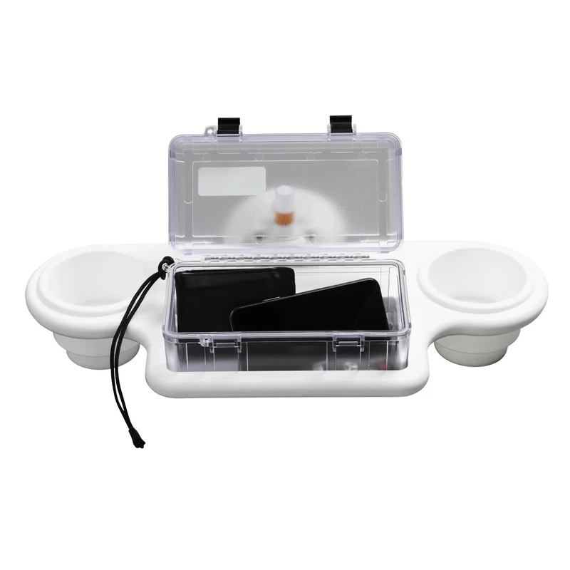 Just like the name says, this 2-cup holder also includes a clear dry box right in the middle of the action, giving you storage for several people’s wallets, cell phones, keys, cameras, etc. Attaches vertically only – great for the side of a console, cooler, or bait tank. Held in place by one sturdy 4.5″ SeaSucker vacuum mount, which means you can put it where you need it, when you need it.
