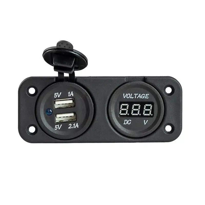 2 port USB socket: One for 1 Amp; One for 2.1 Amp.