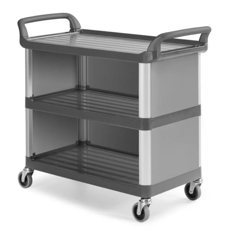 Plastic utility cart closed on three sides with aluminium bases, and three shelves, each shelf can carry up to 50 Kg – Grey