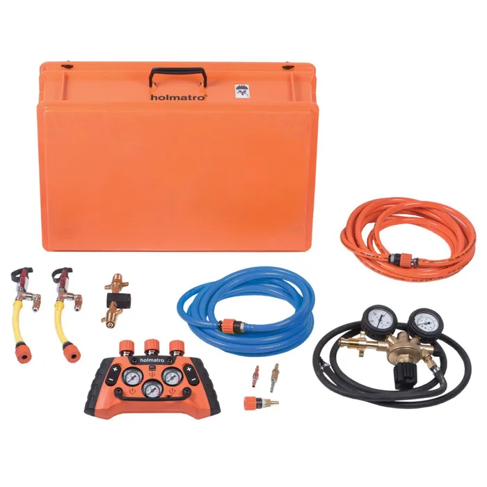 • Includes a synthetic carrying and storage case complete with a control unit, hoses, shut-off hoses, a pressure reducer, air adapters, and a connection piece for 300 bar air bottles.\