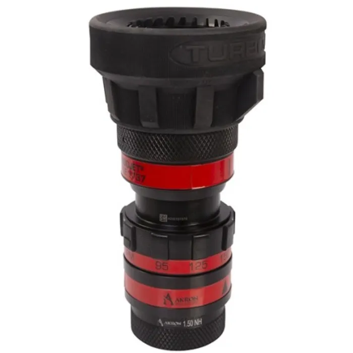 Lightweight fog and straight stream Style 1737 Mid-Range TurboJet tip with multiple fixed constant gallonage settings of 95-125-150-200 gpm (360-475-550-750 lpm) @ 100 or 75 psi (7 or 5 bar). The nozzle shall have spinning teeth, multiple pattern detents, and an extruded Pyrolite body. The nozzle shall also have a minimum 110° angle at wide fog, a full-time swivel inlet, come with a ten year warranty, be capable of flushing without shutting down. Must meet all aspects of NFPA 1964 with test results available.
