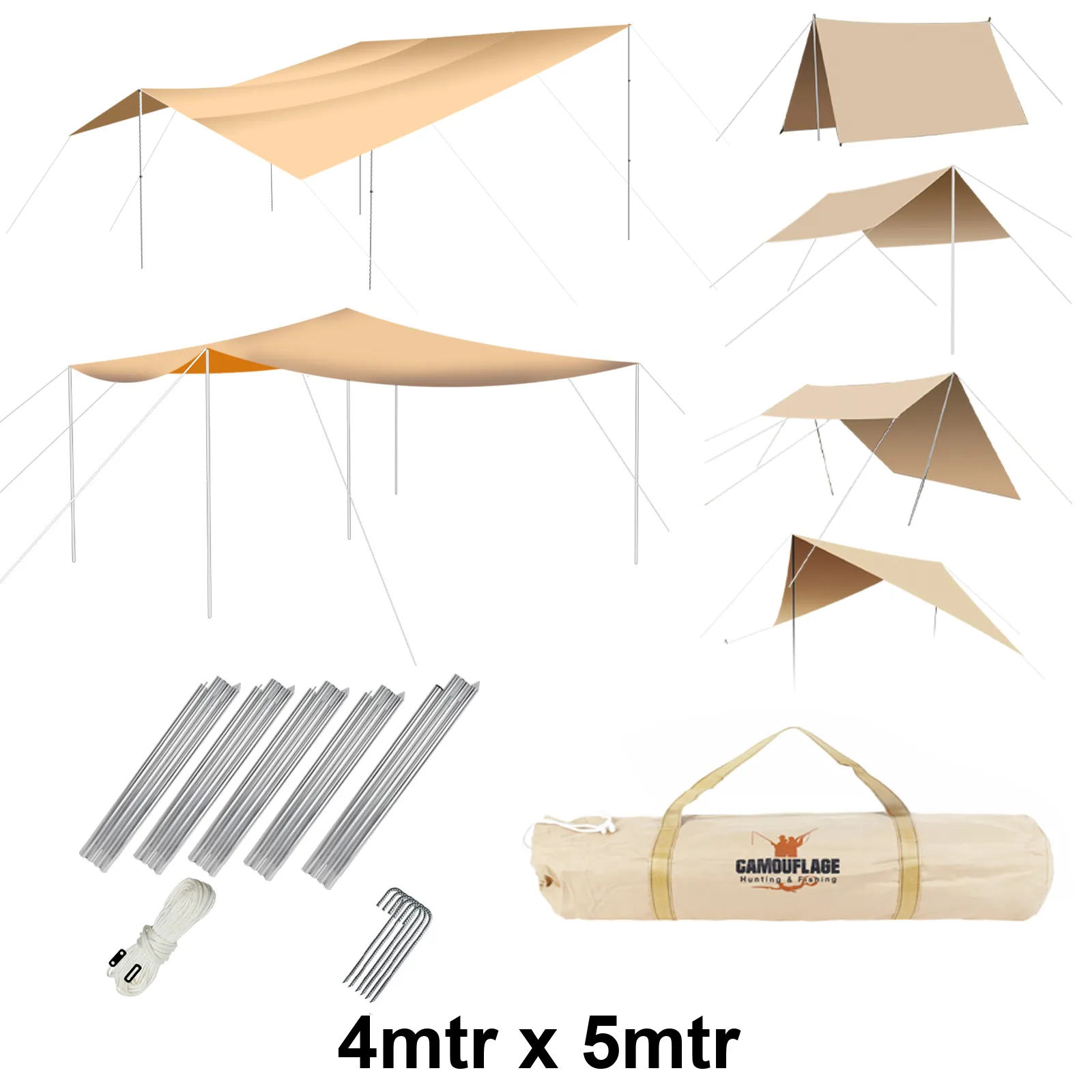 • Contents: 1 shelter, 5 poles, cords, 8 steel pegs, carry bag