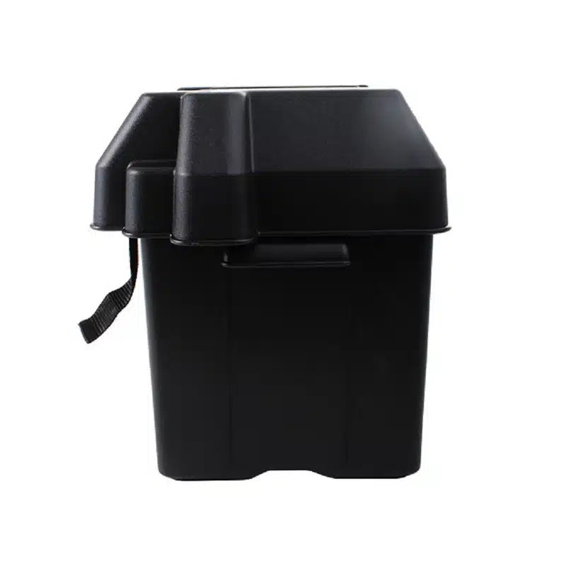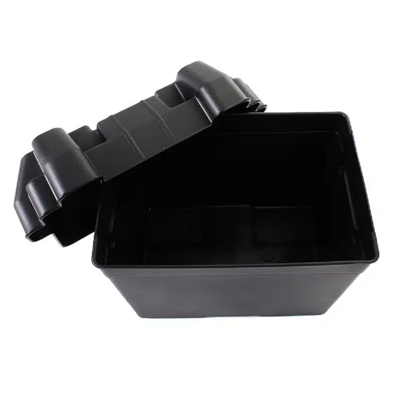 This battery box made of reinforced polyethylene to handle battery acids and has stainless steel fastenings to make it more durable.