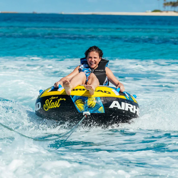 Few towable boat floats offer family fun like Blast 1 , our Airhead Blast 1 Rider Towable Tube. Blast 1 boasts a yellow and teal tropical pattern, 4 neoprene comfort handles, and a self-draining floor that keeps riders upright no matter how much splashing happens.