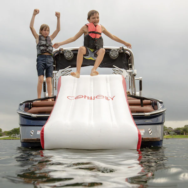 Our boat slide comes complete with sturdy Nylon webbing mounting straps, specifically designed to attach to most boats, and a free 12V air pump for quick inflation/deflation.