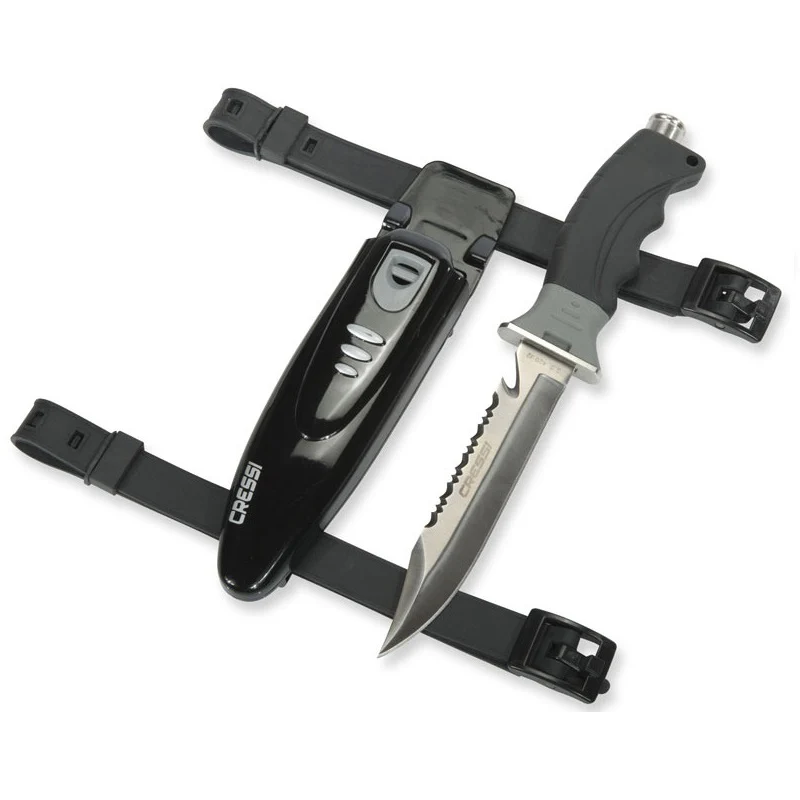 This side of the blade ends, near the handle, with a recess to cut nets and fishing line. The sheath is made of black polymer with loops for attachment to the thigh or belt. The knife attaches to the sheath by means of a spring push button integrated into the sheath itself for rapid use. The knife comes standard with two straps to allow for attachment to the thigh.