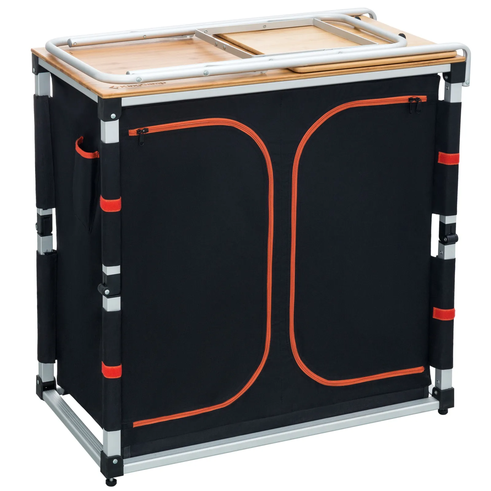 • Multifunctional outdoor kitchen table can supply an outdoor kitchen when families go camping.It has a quick-up system to open up and fold, not need to assemble. Wind board and storage room supply great convince for cooking with a gas stove. And you can wash fruits and hands in basin, cut vegetables on worktable. If you take families to camping, this cooking table will help you to make delicious foods. This stainless steel folding kitchen multifunctional cooking table is combines the locker, BBQ station, work station, sink and extension together, which can make the camping wonderful. The folding design can help you get a very small size after folding to storage.