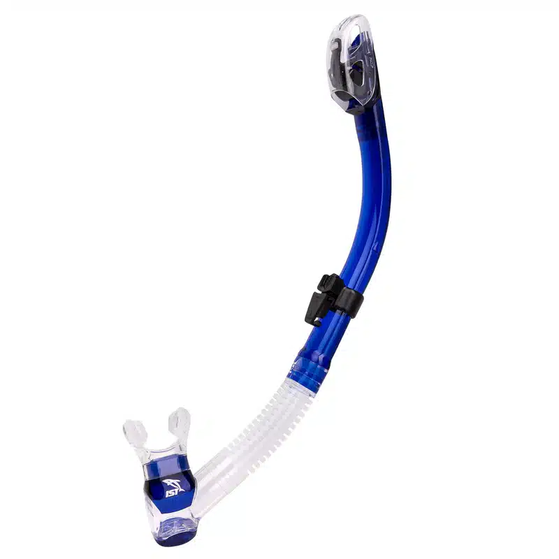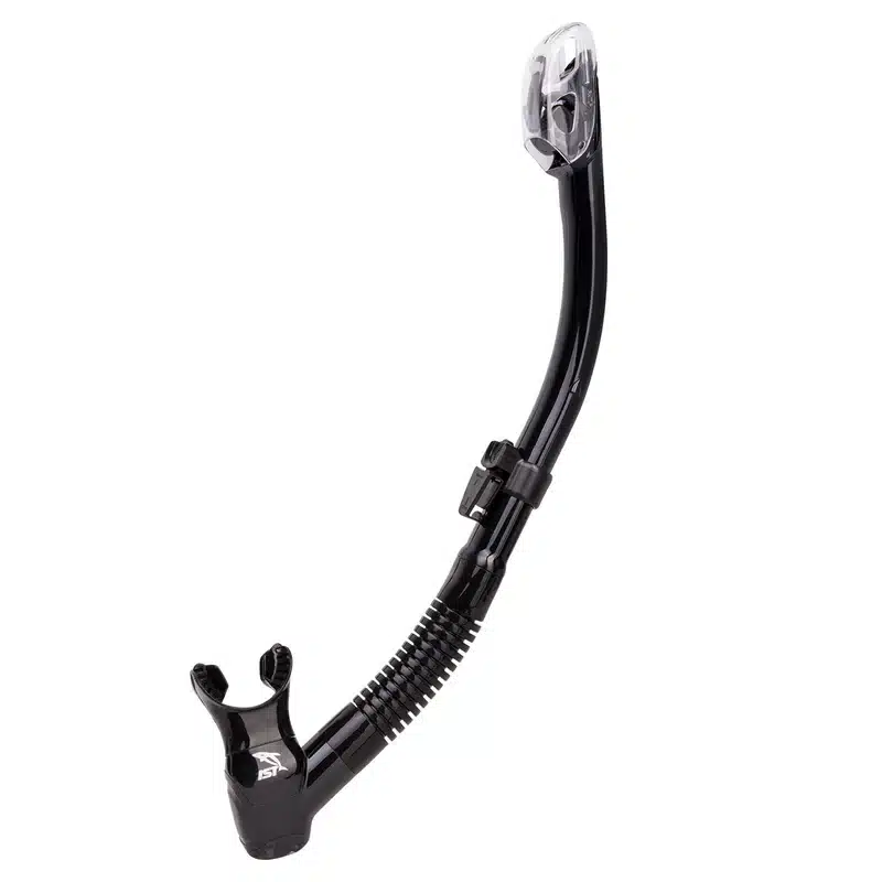 IST Dry Snorkel with Flex Tube and Splash Guard. An exterior splash guard covers the top of the tube to keep water out when buoyant at the surface, while a specially-engineered hinge system and float seal the tube when underwater.