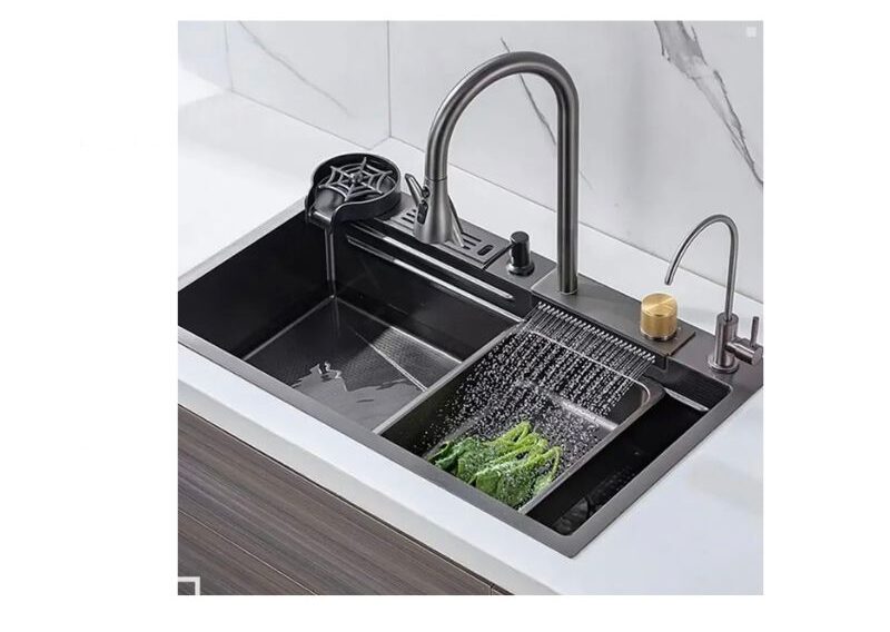 Upgrade your kitchen with this sleek, dual-basin stainless steel sink. Designed for efficiency, it features a pull-down faucet, waterfall rinse tray, built-in soap dispenser, and auxiliary tap. Perfect for rinsing, prepping, and cleaning—all in one stylish, space-saving unit. Rust-resistant and easy to clean, it’s the ultimate modern kitchen essential.