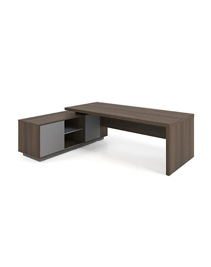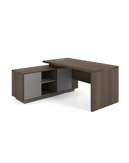 A luxurious L-shaped manager table with a credenza return featuring a number locking system. This series showcases a 40 mm thick worktop, panel leg, and modesty panel for a cohesive aesthetic. The wire management system includes a black lacquered Aluminum flip top and convenient storage with a pull-out drawer and soft-closing swing door cabinet.