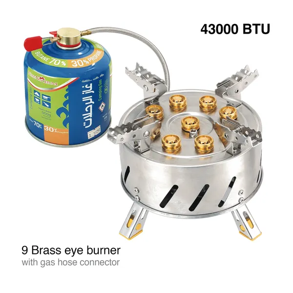 Weight: 1900g Made of copper and stainless steel alloy Contains 9 very strong flameburners Thermal power 12800W Equipped with a 1-meter tube The only way to get the men out of the world is to get the men out Strong and sturdy Strong fire and high efficiency Folding, portable and small Ideal for camping, trekking, hiking and fishing trips Carry bag included