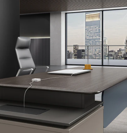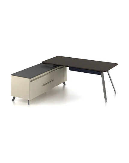 The exceptional executive L-shaped desk in veneer showcases a rectangular 3-dimensionally soft curving veneer worktop and a floating storage worktop, combining style and functionality seamlessly. With a concealed lock for pull-out drawers and convenient wire management, this desk offers stability and enhanced productivity.