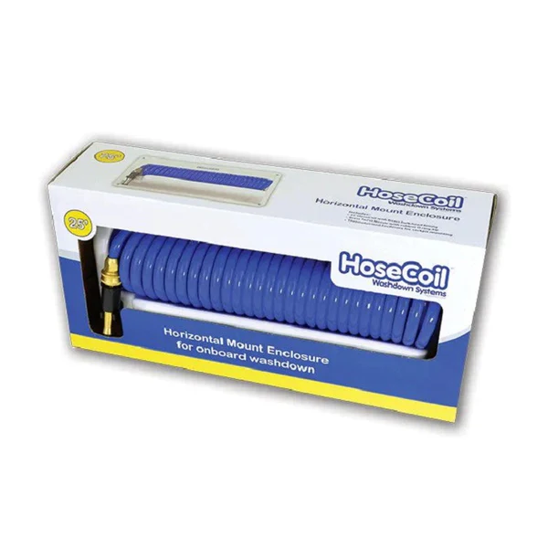 The enclosure includes a 3/8” ID 25’ HoseCoil and nozzle which can be plumbed directly into your existing pressurized water system or raw water washdown pump.
