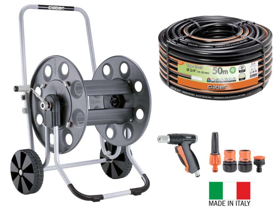 Hose : 3/4″ x 50 mtr, with trolley, spray gun and couplers, Made in Italy