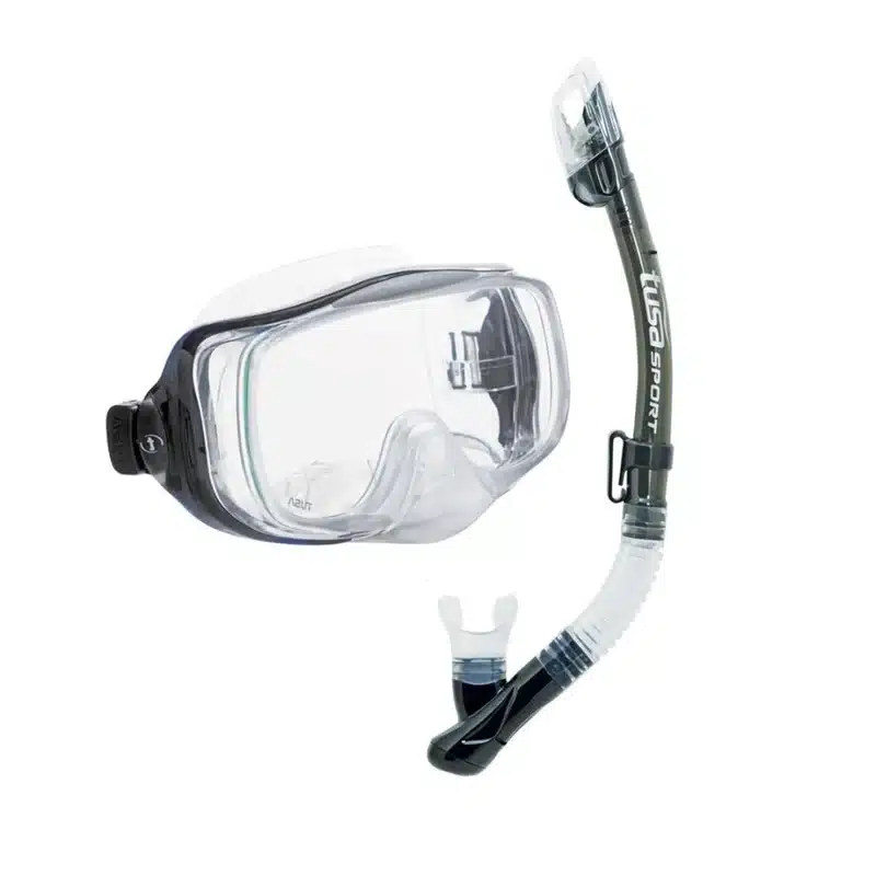 The UC-3325 Imprex 3-D Dry includes a single window mask that incorporates 2 side windows for enhanced panoramic and peripheral vision, TUSA’s patented Hyperdry nose-purge system which allows for easy, no-nonsense clearing of the mask with a single exhalation, EZ adjust buckle technology, ClearVu tempered glass lens and pure silicone skirt and strap. The dry snorkel features TUSA Hyperdry Elite dry top technology (pat p) that stops water from entering into the snorkel, a drain chamber and purge valve for easy clearing and pure silicone flex neck and mouthpiece.