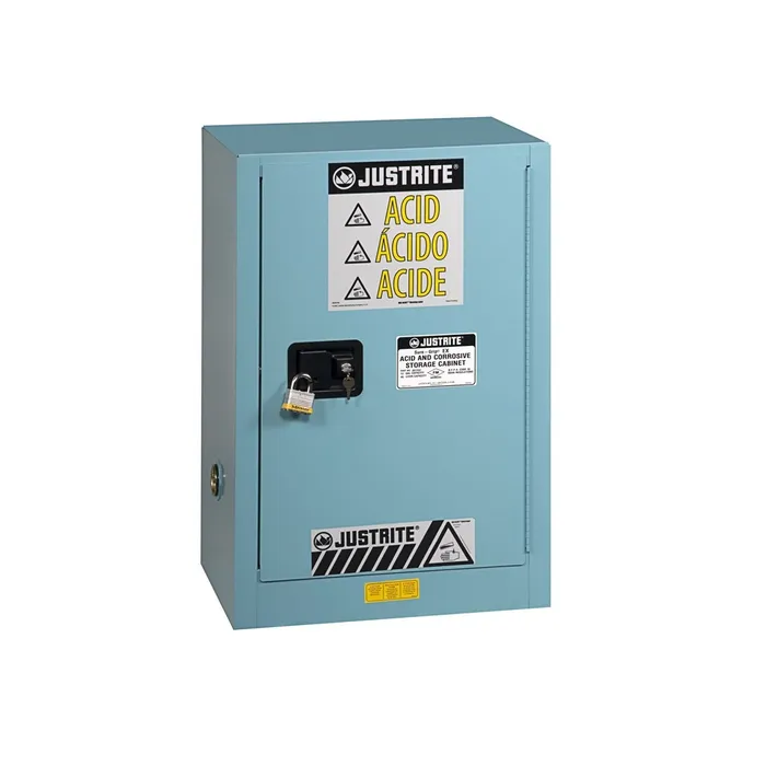 Justrite blue steel safety cabinets for corrosives have the same quality safety features as the cabinets for flammables. All models come with double-wall construction, dual vents, grounding wire connections, adjustable shelves, leakproof sills, three-point self-latching doors and leveling feet. Self-close door(s) shuts and latches automatically when a fusible link melts at 165°F (74ºC) under fire conditions. Unique, concealed self-closing mechanism offers obstruction-free access to contents.