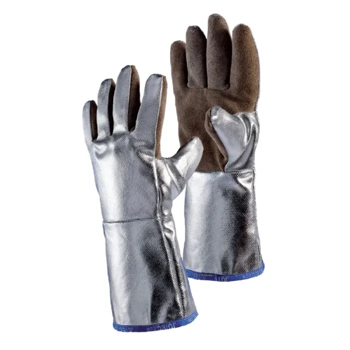 JUTEC® Heat Protection Glove is a 5-finger-glove made of heat-resistant brown Sebatan-Leather and with flexible aluminum coating on a Preox-Aramid fabric on the outside surface of the handle among other things designed for easy welding with emerging radiation heat. The Sebatan®-Leather won‘t also be hard due to the heat and retains its good properties. Application area: welding, foundries, metal industry, shipbuilding, etc.