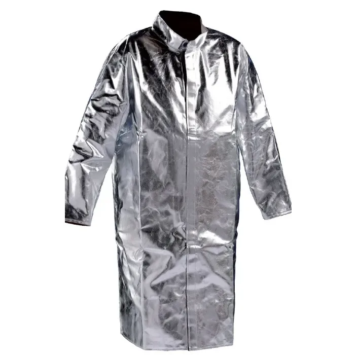Aluminized heat protection coats made of Preox-Aramid fabric (KA-2) cover the employee depending on the length scale up to the fibula. The standard coat features a covered central heat resistant Velcro fastener and a stand-up collar with insulated press button. The smooth surface allows a high level of reflection, the extreme softness of the material a perfect fit.