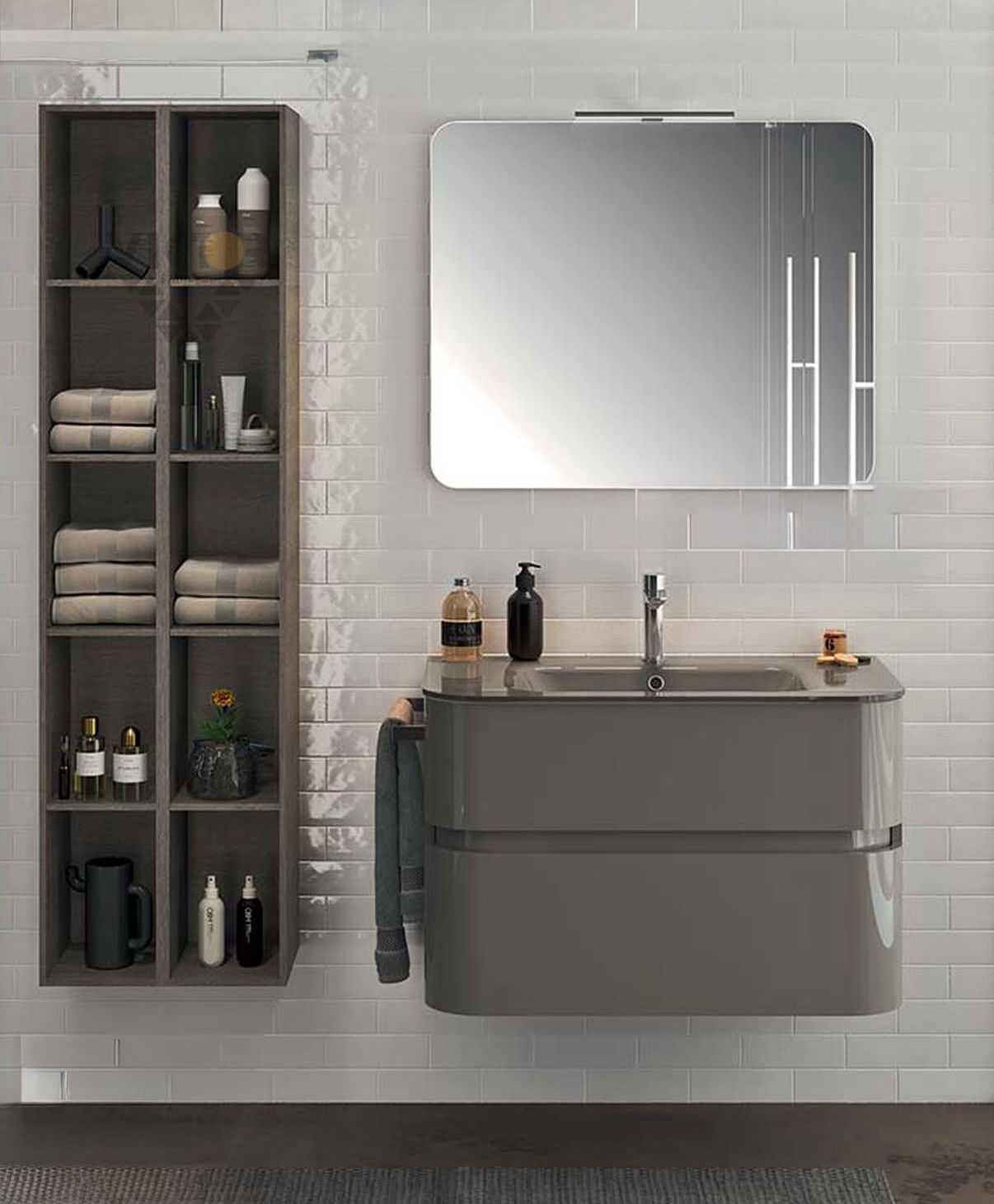 🔹 Smartly divided side cabinet to neatly organize your essentials and towels.