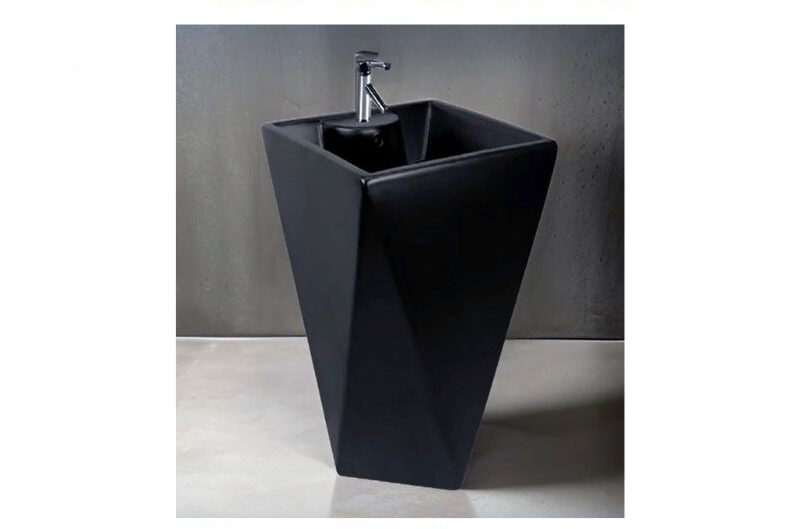Freestanding pedestal sink with a unique geometric, tapered design in matte black. It features a sleek chrome faucet mounted at the top, creating a bold and contemporary statement piece. The minimalist form and dark finish give it a luxurious and sculptural appearance, ideal for modern or industrial-style bathrooms.