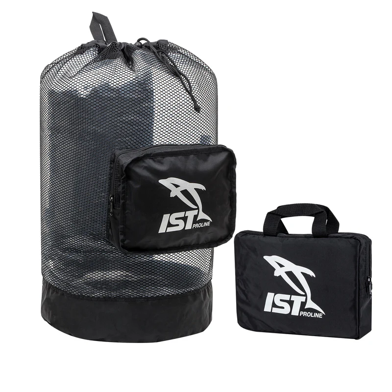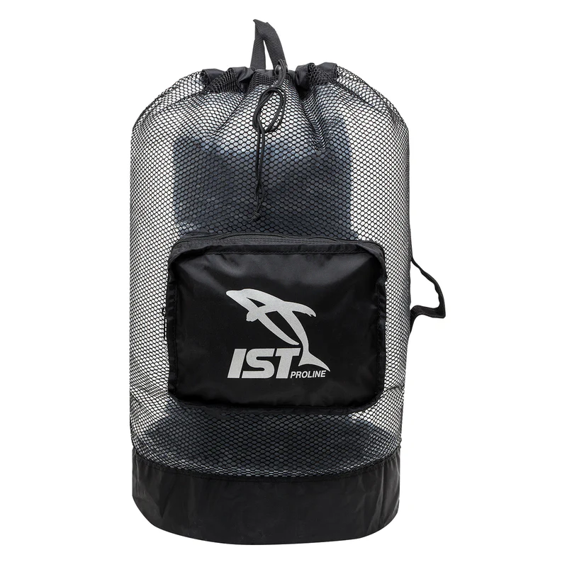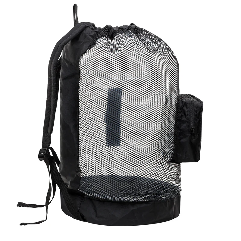 Large collapsible wet gear backpack with mesh front, solid bottom and back, padded shoulder straps, side and top carrying handles, sleeve drawstring top closure.