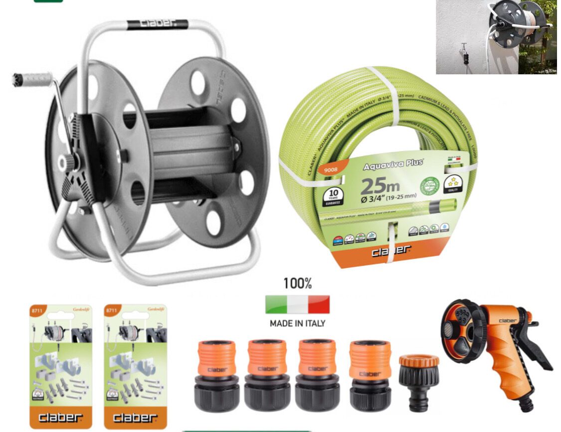 Hose : 3/4″ x 25 mtr, with wall mounted reel, spray gun and couplers, Made in Italy