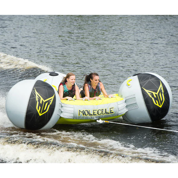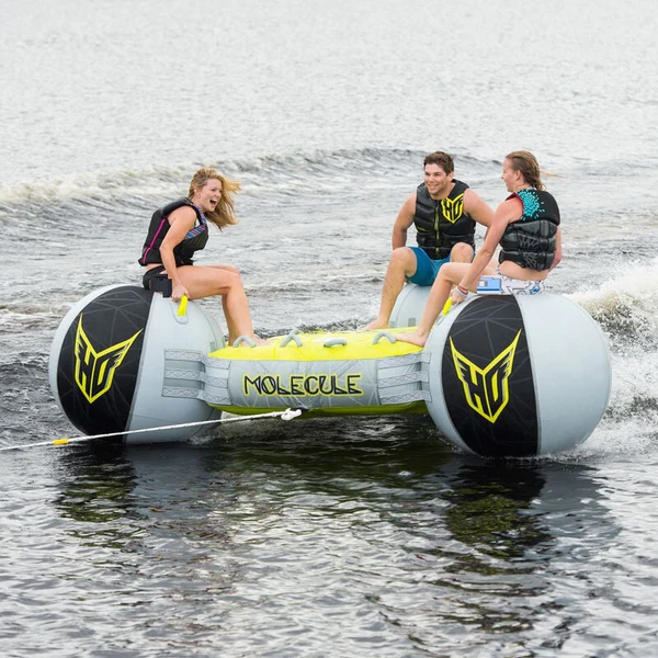 The Molecule uses the latest and most innovative technology in inflatables to perform like no other tube has ever dreamed! Its innovative, patented design isn’t just for looks. Using 3 spheres, the center platform is suspended above the water with only the spheres contacting the surface. This dramatically lowers the surface contact and drag behind the boat. The result is an extremely quick sliding, large tube that works equally well on rough or smooth water. There are tons of handles, two towing orientations, and the riding positions are only limited by your own imagination.