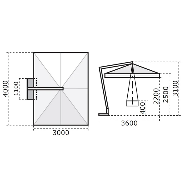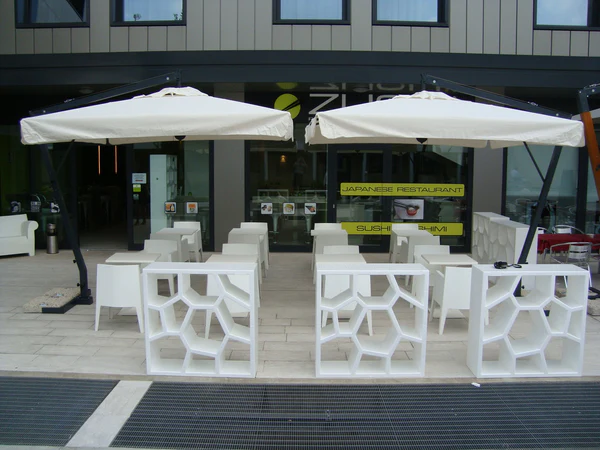 Handy cantilever parasol entirely made of epoxy lacquered steel and aluminium, keeps its refined design unchanged. Updated and improved base and swivel system.
