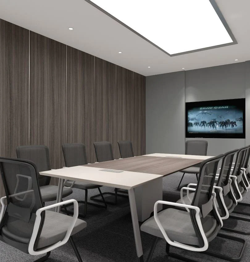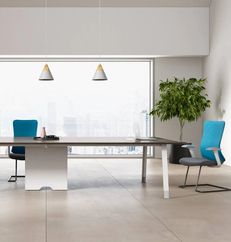 The Noqi Rectangular Meeting Table with Wooden Tabletop and Steel Legs is a long, rectangular shape that can seat up to 12 people comfortably. It is made of a durable wooden tabletop and steel legs with an aluminum alloy base, making it both sleek and sturdy. The table is available in 2 Wooden Finishes or solid white top.