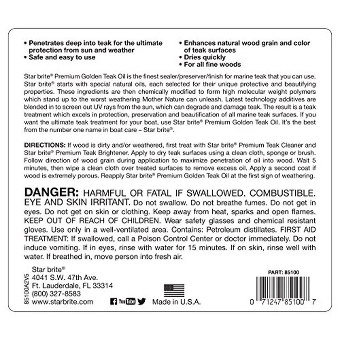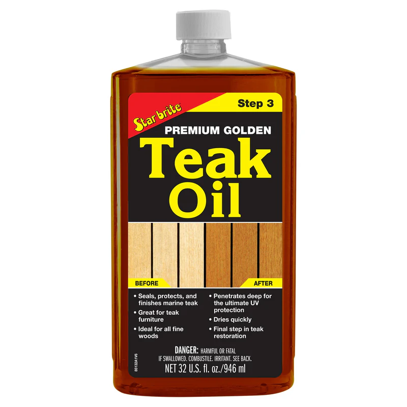 Star brite Premium Golden Teak Oil is the finest sealer/preserver/finish for marine teak and other fine woods. Star brite uses premium natural oils that are ultra-refined and chemically modified to form high molecular weight polymers that withstand long-term exposure to salt water and harsh weather. Ideal for use on all fine woods and wood furniture. Extra long lasting protection for teak. Gives teak a natural warm golden color.
