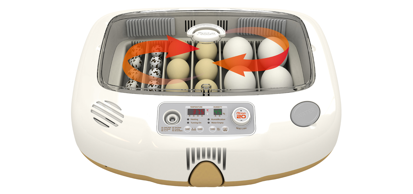 - Automatic egg-turning function: Rcom MAX 20 DO turns automatically according to the settings, featuring a low-noise stepping egg-turning motor. Egg-turning stop setting is necessary 3 days before the hatching day.