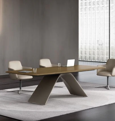 Experience the pinnacle of modern sophistication with the Ring Meeting Table. This high-end conference/meeting table features a sleek veneer finish and angled panel legs, creating a contemporary and elegant look. With its generous size, it comfortably accommodates 6-8 people, making it perfect for productive meetings. The 3-dimensionally soft curving boat-shaped veneer worktop provides ample space for collaboration and discussion.