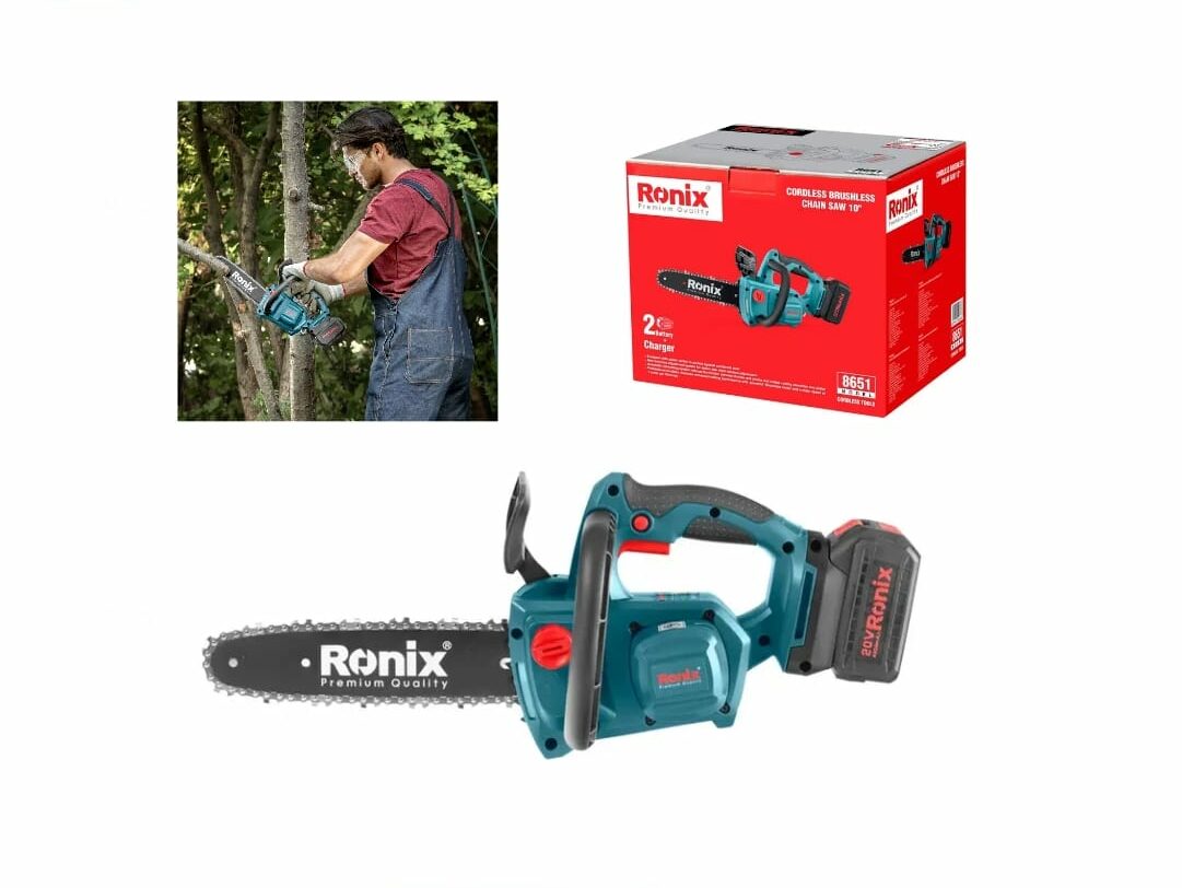 Power through trimming, pruning, and small cutting tasks with the convenient Ronix 20V Brushless Chain Saw. This compact and lightweight chainsaw offers cordless maneuverability for effortless woodcutting. Includes 1 battery and charger.