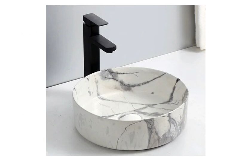Round Marble Vessel Sink with Matte Black Faucet