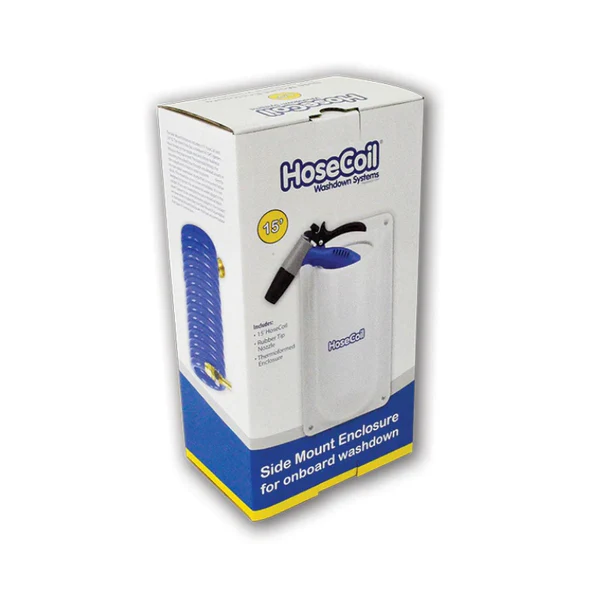 The Side Mount Enclosure is constructed of durable, high density ABS and is popular for mounting a 15’ Coiled Hose with barbed through-bulkhead fitting in the cockpit.