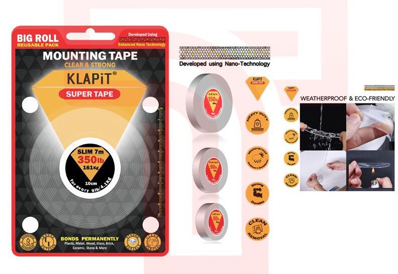 Klapit Strong Double-Sided Tape is a high-bond adhesive tape ideal for securely mounting a variety of objects to smooth surfaces. This slim tape offers a strong and long-lasting hold that supports up to 161kg, making it perfect for posters, signs, pictures, and other items. The 7-meter length provides ample tape for multiple uses. Klapit Strong Double-Sided Tape is easy to use and removes cleanly without leaving any residue.