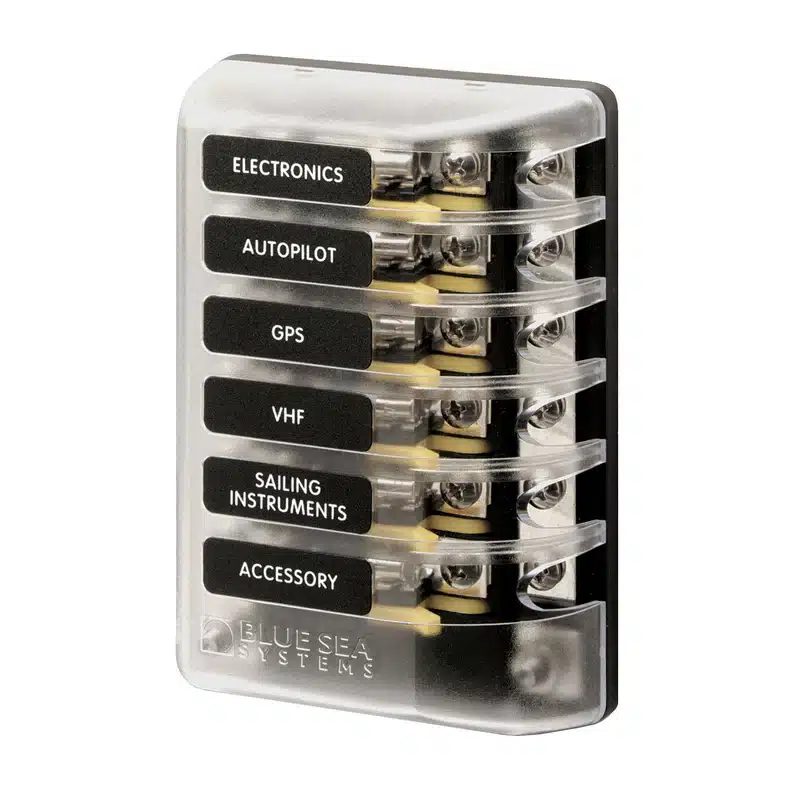 ST Glass 6 Circuit Fuse Block with Negative Bus and Cover. Innovative design allows for labeling, spare fuse storage, and easy fuse removal.