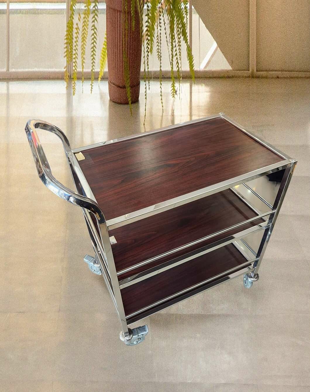 THREE LAYER TROLLEY STAINLESS STEEL 201 MIRROR FINISH WITH WOODEN SHELVES. SIZE 73*46*86CM