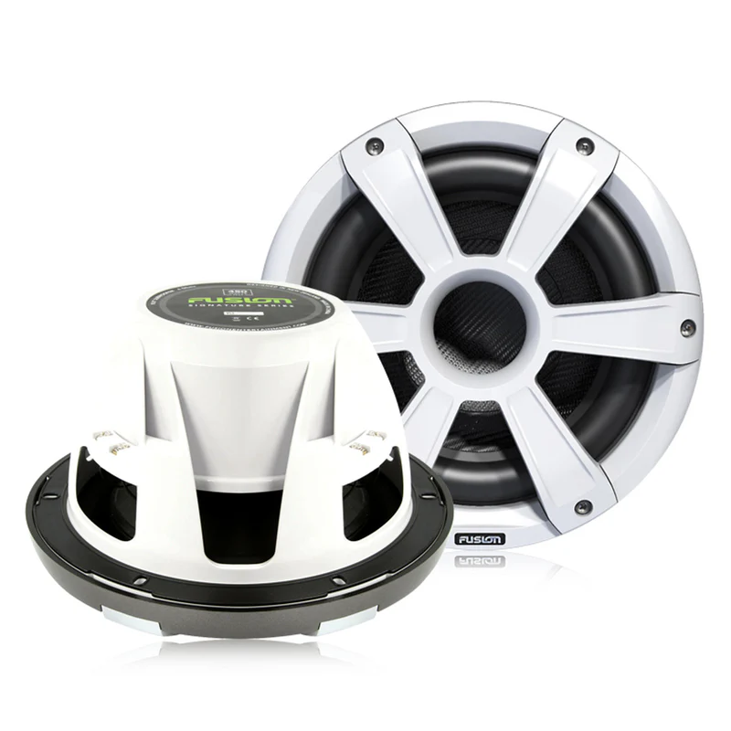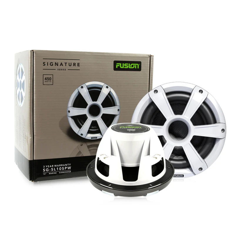 10″ 450 Watt Sports White Marine Subwoofer with LEDs . Featuring an elegantly updated Sports style grille, these stylish subwoofers are engineered with a large diameter voice coil and a 10” high tensile fiberglass-paper composite cone that produces an impressive 450 Watts peak power.