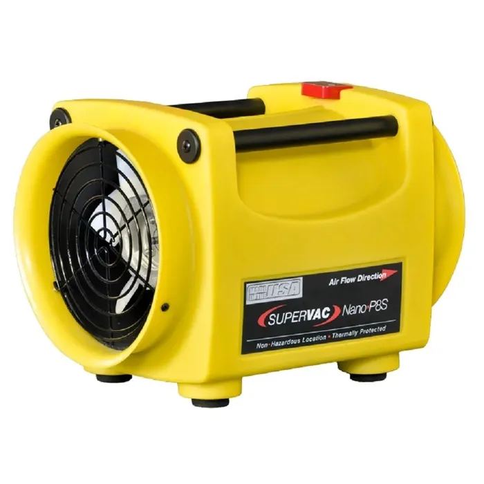 The Super Vac Nano P8S is an 8″ electric confined space fan built for exceptional strength, efficiency, and reliability. Its square design enhances durability, while convenient carrying handles on each corner allow for easy positioning and quick deployment. Proudly made and assembled in the USA, this fan showcases premium craftsmanship.