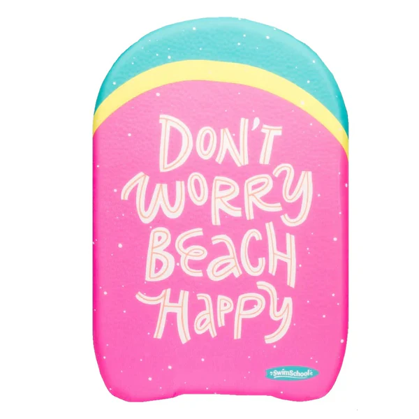 Pink Kickboard reads “Don’t Worry Beach Happy.”