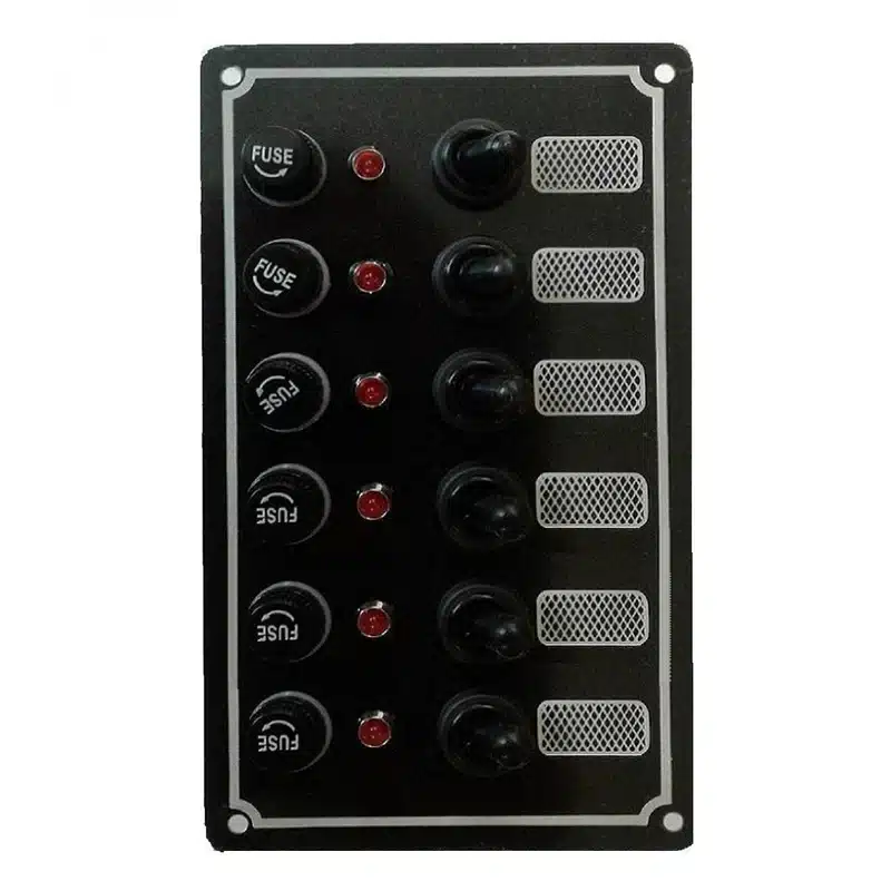 Waterproof Switch panel with fuse holder and toggle switches.