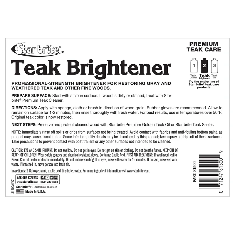 Brightens teak and other fine woods. Highlights wood grain and enhances warm natural color. Use as the second step in the restoration of grey weathered teak.