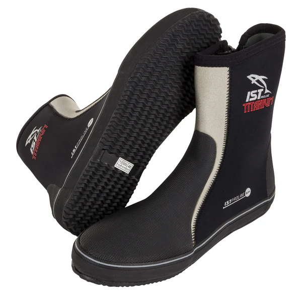5 mm titanium and spandex lined neoprene boots with vulcanized rubber sole.
